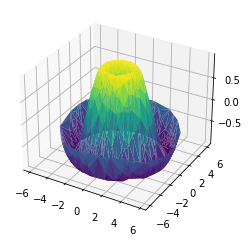 이 포인트 클라우드는 아쉬운 점이 많습니다. 이 경우에 도움이 될 함수는 ax.plot_trisurf입니다. 이 함수는 먼저 인접한 점 사이에 형성된 삼각형 세트를 찾아 표면을 생성합니다(여기서 x, y 및 z는 1차원 배열이라는 점을 기억하세요). 다음 그림은 결과를 보여줍니다.