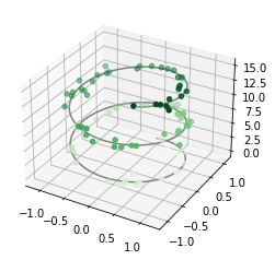 ax.scatter3D(xdata, ydata, zdata, c=zdata, cmap="Greens");