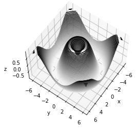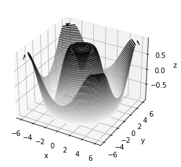 ax.contour3D(X, Y, Z, 40, cmap="binary")