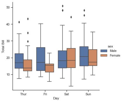 g = sns.catplot(x="day", y="total_bill", hue="sex", data=tips, kind="box")