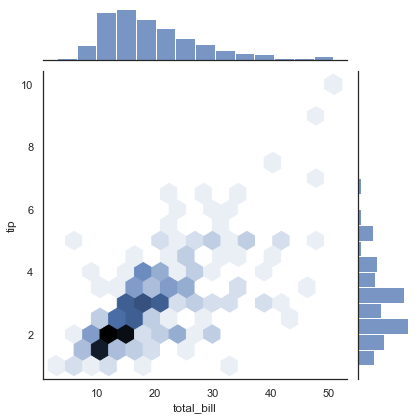 sns.jointplot(x="total_bill", y="tip", data=tips, kind="hex")