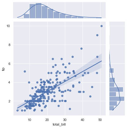 sns.jointplot(x="total_bill", y="tip", data=tips, kind="reg");