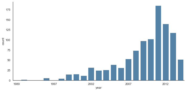 g = sns.catplot(x="year", data=planets, aspect=2, kind="count", color="steelblue")