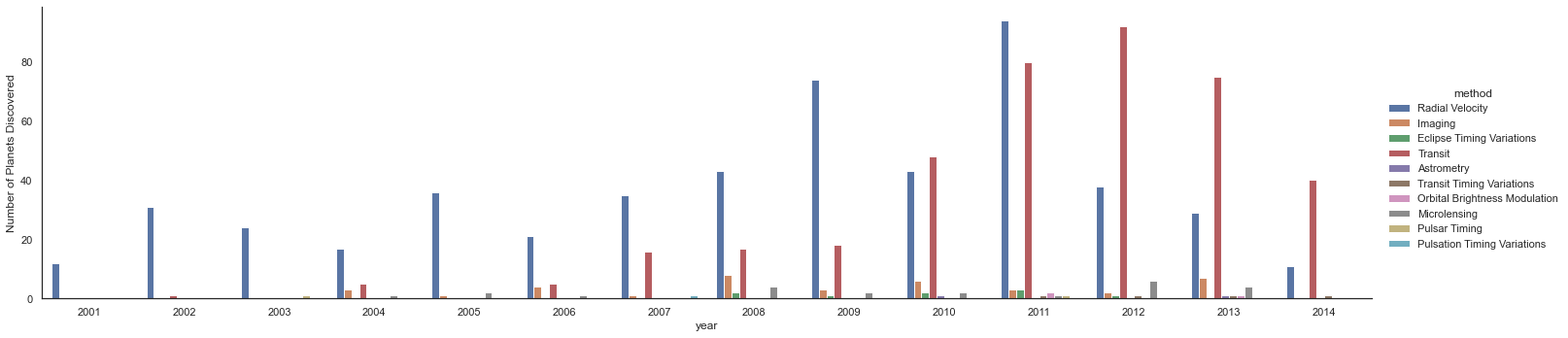 시계열은 sns.factorplot을 사용하여 그릴 수 있습니다. 다음 예에서는 집계 및 그룹화에서 처음 본 Planets 데이터 세트를 사용합니다. 결과는 다음 그림을 참조하세요.