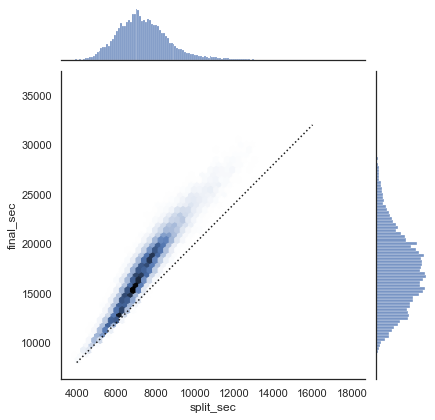점선은 완벽하게 안정된 속도로 마라톤을 달릴 경우 그 사람의 시간이 어디에 있을 것인지를 보여줍니다. 분포가 이보다 높다는 사실은 (예상할 수 있듯이) 대부분의 사람들이 마라톤을 진행하는 동안 속도가 느려진다는 것을 나타냅니다. 경쟁적으로 달리는 경우, 반대 방향으로 달리는 사람들(경주 후반부에 더 빠르게 달리는 사람들)을 경주에서 “부정 분할”했다고 합니다.