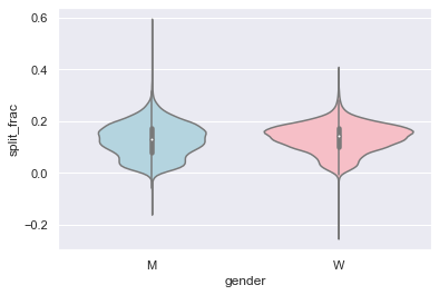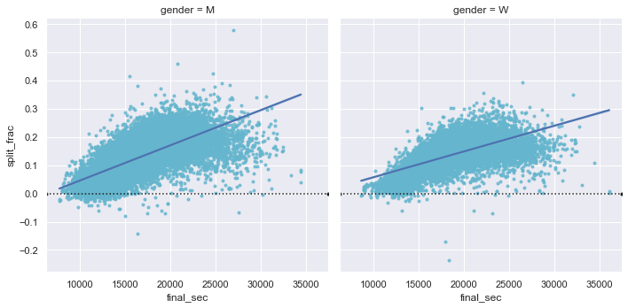 분명히 남성과 여성 모두에서 빠른 스플릿을 가진 사람들은 약 15,000초, 즉 약 4시간 이내에 완주하는 더 빠른 주자들인 경향이 있습니다. 그보다 느린 사람들은 빠른 두 번째 분할을 가질 가능성이 훨씬 적습니다.