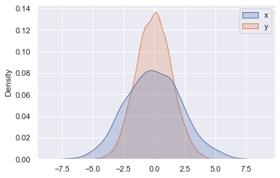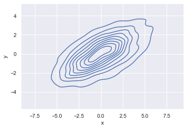 x 및 y 열을 kdplot에 전달하면 대신 결합 밀도의 2차원 시각화를 얻습니다(다음 그림 참조).
