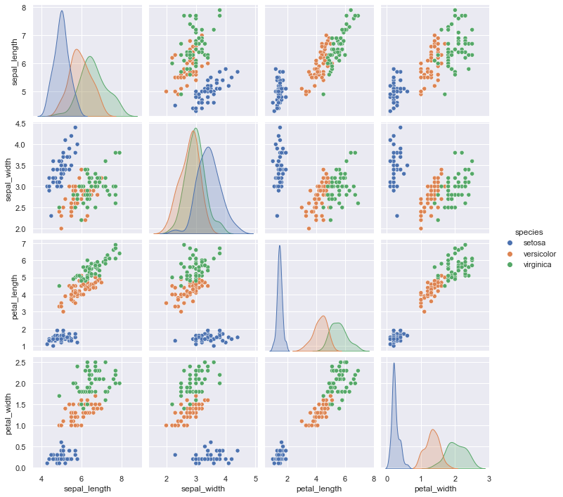 샘플 간의 다차원 관계를 시각화하는 것은 sns.pairplot을 호출하는 것만큼 쉽습니다(다음 그림 참조).
