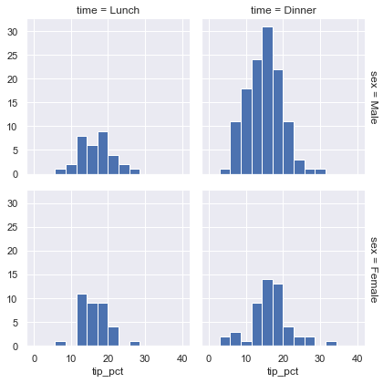 grid.map(plt.hist, "tip_pct", bins=np.linspace(0, 40, 15));