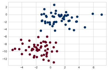 아마도 이해하기 가장 쉬운 순진한 베이즈 분류기는 가우스 순진한 베이즈일 것입니다. 이 분류기를 사용하면 각 레이블의 데이터가 단순 가우스 분포에서 추출된다고 가정합니다. 그림 41-1에 표시된 다음 데이터가 있다고 상상해 보십시오.