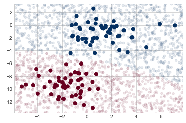 plt.scatter(Xnew[:, 0], Xnew[:, 1], c=ynew, s=20, cmap="RdBu", alpha=0.1)