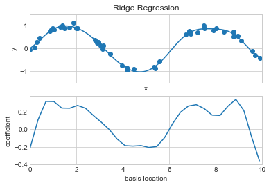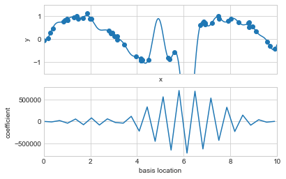 선형 회귀에 기본 함수를 도입하면 모델이 훨씬 더 유연해지지만 매우 빠르게 과적합으로 이어질 수도 있습니다(이에 대한 자세한 내용은 하이퍼파라미터 및 모델 검증을 참조하세요). 예를 들어 다음 그림은 다수의 가우스 기반 함수를 사용하면 어떤 일이 발생하는지 보여줍니다.