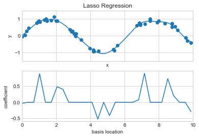 올가미 회귀 페널티를 사용하면 대부분의 계수가 정확히 0이며 기능적 동작은 사용 가능한 기본 함수의 작은 하위 집합으로 모델링됩니다. 능선 정규화와 마찬가지로 \(\alpha\) 매개변수는 페널티의 강도를 조정하며 교차 검증 등을 통해 결정해야 합니다(이에 대한 자세한 내용은 하이퍼파라미터 및 모델 검증을 참조하세요).