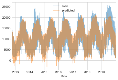 daily[['Total', 'predicted']].plot(alpha=0.5);
