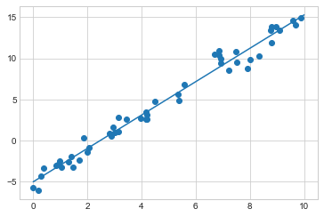 데이터의 기울기와 절편은 모델의 맞춤 매개변수에 포함되어 있으며 Scikit-Learn에서는 항상 밑줄로 표시됩니다. 여기서 관련 매개변수는 coef_ 및 intercept_입니다.