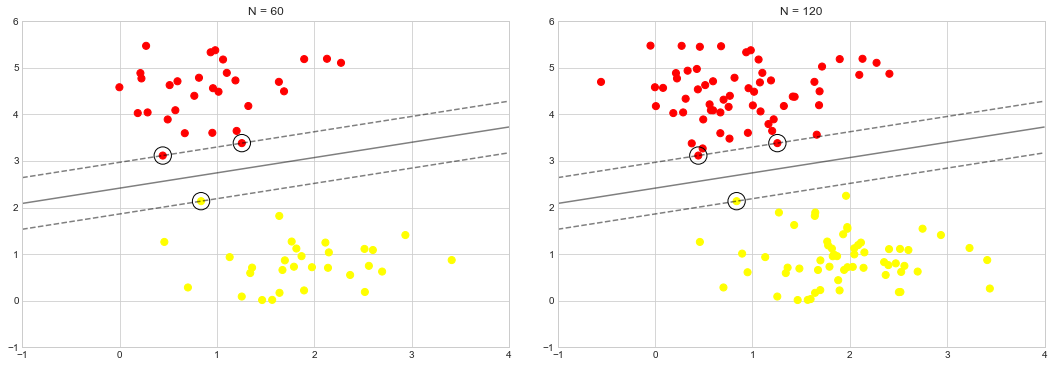 왼쪽 패널에는 60개의 훈련 포인트에 대한 모델과 지원 벡터가 표시됩니다. 오른쪽 패널에서는 훈련 포인트 수를 두 배로 늘렸지만 모델은 변경되지 않았습니다. 왼쪽 패널의 세 가지 지원 벡터는 오른쪽 패널의 지원 벡터와 동일합니다. 멀리 있는 지점의 정확한 동작에 대한 이러한 둔감성은 SVM 모델의 강점 중 하나입니다.