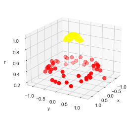 r = np.exp(-(X**2).sum(1))다음 그림과 같이 3차원 플롯을 사용하여 이 추가 데이터 차원을 시각화합니다.