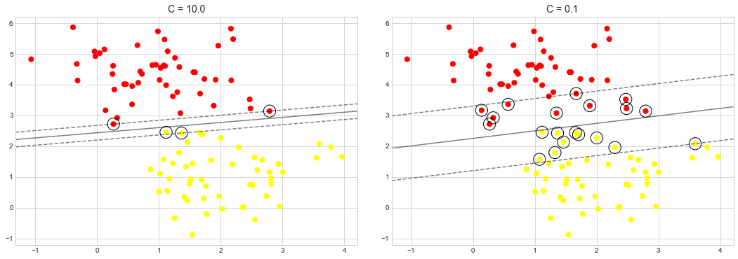 이 경우를 처리하기 위해 SVM 구현에는 여백을 “부드럽게” 하는 약간의 퍼지 요소가 있습니다. 즉, 더 나은 적합성을 허용하는 경우 일부 포인트가 여백 안으로 들어갈 수 있도록 허용합니다. 마진의 경도는 가장 흔히 ’C’로 알려진 조정 매개변수에 의해 제어됩니다. 매우 큰 ’C’의 경우 여백이 단단하고 점이 그 안에 있을 수 없습니다. 더 작은 ’C’의 경우 여백은 더 부드러워지고 일부 지점을 포함하도록 커질 수 있습니다.