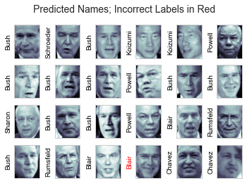 fig.suptitle("Predicted Names; Incorrect Labels in Red", size=14);
