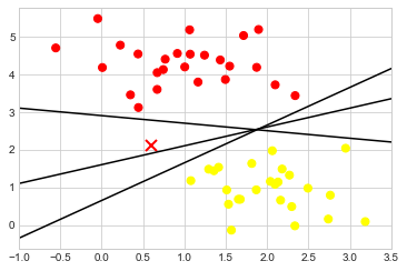 그럼에도 불구하고 이 세 가지 매우 다른 분리기는 이러한 샘플을 완벽하게 구별합니다. 선택한 항목에 따라 새 데이터 포인트(예: 이 플롯에서 “X”로 표시된 데이터 포인트)에 다른 레이블이 할당됩니다! 분명히 “클래스 사이에 선을 긋는 것”에 대한 우리의 단순한 직관만으로는 충분하지 않으며 좀 더 깊이 생각할 필요가 있습니다.