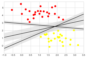 서포트 벡터 머신은 이를 개선할 수 있는 한 가지 방법을 제공합니다. 직관은 다음과 같습니다. 단순히 클래스 사이에 너비가 0인 선을 그리는 대신 각 선 주위에 가장 가까운 지점까지 어느 정도 너비의 여백을 그릴 수 있습니다. 다음은 이것이 어떻게 보이는지에 대한 예입니다(다음 그림 참조).