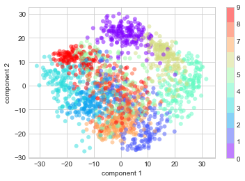 차원 축소의 유용성은 2차원에서만 완전히 드러나지 않을 수 있지만 고차원 데이터를 보면 분명해집니다. 이를 확인하기 위해 심층: 의사결정 트리 및 랜덤 포레스트에서 작업한 숫자 데이터 세트에 PCA를 적용하는 방법을 간략하게 살펴보겠습니다.