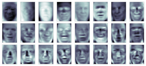 픽셀 기반과 달리 PCA 기반을 사용하면 평균과 8개의 구성 요소만으로 입력 이미지의 두드러진 특징을 복구합니다. 각 구성 요소의 각 픽셀 양은 2차원 예에서 벡터 방향의 결과입니다. 이는 PCA가 데이터의 저차원 표현을 제공한다는 의미입니다. 즉, 입력 데이터의 기본 픽셀 기반보다 더 효율적인 기본 기능 세트를 찾습니다.