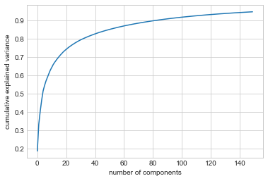 이 데이터 세트에 걸쳐 있는 주요 축을 살펴보겠습니다. 이것은 큰 데이터 세트이기 때문에 PCA 추정기에서 `“무작위” 고유 솔버를 사용합니다. 이는 일부 정확도를 희생하면서 표준 접근 방식보다 더 빠르게 첫 번째 \(N\) 주성분을 근사화하기 위해 무작위 방법을 사용합니다. 이러한 절충안은 고차원 데이터(여기서는 거의 3,000차원)에 유용합니다. 처음 150개의 구성요소를 살펴보겠습니다.