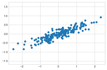 주성분 분석은 데이터의 차원 축소를 위한 빠르고 유연한 비지도 방법으로, Scikit-Learn 소개에서 간략하게 살펴보았습니다. 그 동작은 2차원 데이터 세트를 보면 가장 쉽게 시각화합니다. 다음 200개 점을 고려하십시오(다음 그림 참조).