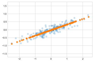 밝은 점은 원본 데이터이고 어두운 점은 투영된 버전입니다. 이는 PCA 차원 축소가 무엇을 의미하는지 명확하게 보여줍니다. 즉, 가장 중요하지 않은 주축을 따른 정보가 제거되고 분산이 가장 높은 데이터 구성 요소만 남습니다. 잘라낸 분산 비율(이전 그림에서 형성된 선 주위의 점 확산에 비례)은 대략 이러한 차원 축소에서 얼마나 많은 “정보”가 폐기되는지를 측정한 것입니다.