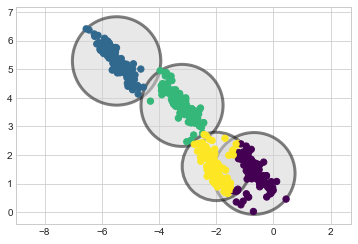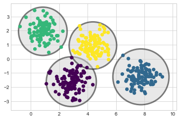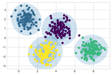 k-평균 모델에 대해 생각하는 한 가지 방법은 각 클러스터의 중심에 원(또는 더 높은 차원에서는 초구)을 배치하고 반경은 클러스터에서 가장 먼 지점으로 정의된다는 것입니다. 이 반경은 훈련 세트 내의 클러스터 할당에 대한 하드 컷오프 역할을 합니다. 이 원 밖의 모든 지점은 클러스터의 구성원으로 간주되지 않습니다. 다음 함수를 사용하여 이 클러스터 모델을 시각화합니다(다음 그림 참조).