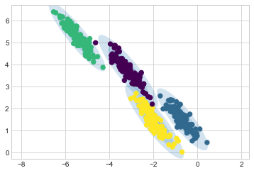 draw_ellipse(pos, covar, alpha=w * w_factor)이를 통해 4개 구성 요소 GMM이 초기 데이터에 대해 제공하는 내용을 살펴볼 수 있습니다(다음 그림 참조).