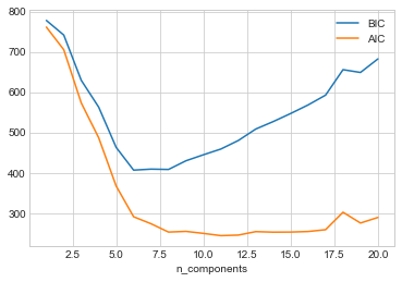 달 데이터 세트의 AIC 및 BIC와 GMM 구성 요소 수를 살펴보겠습니다(다음 그림 참조).