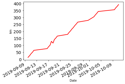 df["Distance"].cumsum().plot.line(fontsize=14, linewidth=2, color="r", ylabel="km");