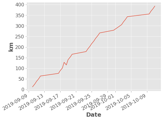 )df["Distance"].dropna().cumsum().plot.line(ylabel="km");
