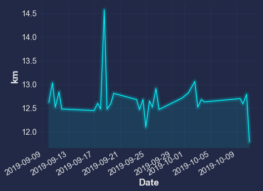 df = pd.read_csv("data/cycling_data.csv", index_col=0, parse_dates=True).dropna()이제 내가 탔던 거리를 도표로 만들어 보겠습니다.