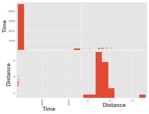 위 데이터에는 ~48,000의 시간 값인 이상치 시간이 있습니다. 그것을 제거하고 다시 플롯합시다.