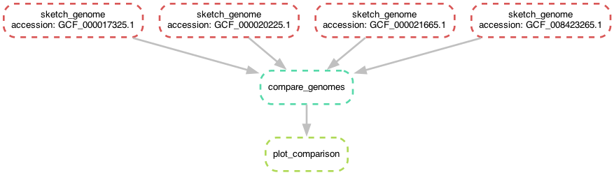 새 게놈을 비교에 추가하려면, 스케치 파일을 compare_genomes의 input:에 추가하기만 하면 됩니다. 그러면 Snakemake가 자동으로 연관된 게놈 파일을 찾아 sketch_genome을 실행한 후 (이전 챕터와 같이), compare_genomes를 실행합니다. 나머지는 Snakemake가 알아서 처리해 줍니다!