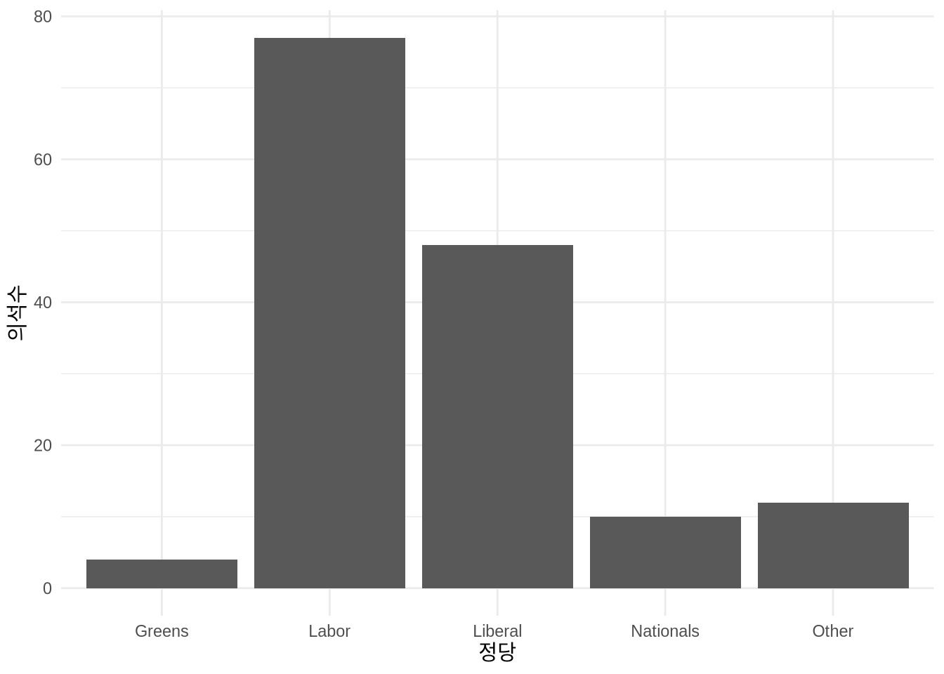호주는 하원(House of Representatives) 151석을 기반으로 정부가 구성되는 의회 민주주의 국가입니다. 주요 정당으로는 자유당(Liberal)과 노동당(Labor)이 있으며, 국민당(National), 녹색당(Greens) 등 소수 정당과 무소속 의원들이 함께 활동합니다. 이번 예제에서는 2022년 호주 연방 선거 결과를 정당별 의석수로 시각화해 보겠습니다.