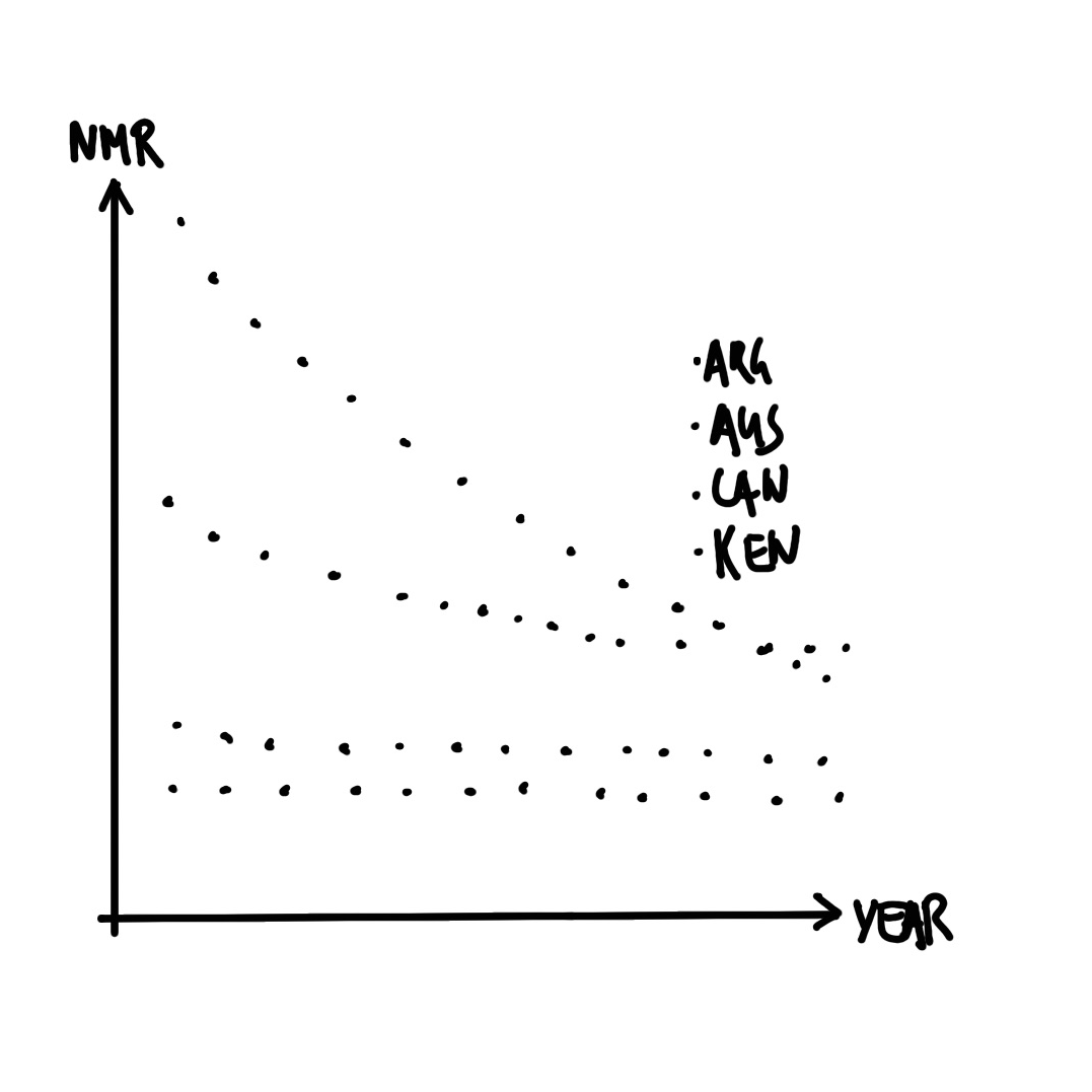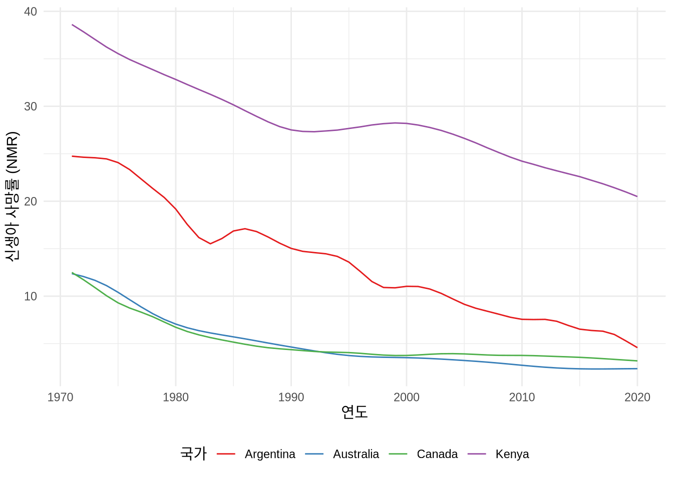 신생아 사망률(Neonatal Mortality Rate, NMR)은 생후 28일 이내에 사망하는 영유아의 비율을 출생아 1,000명당 숫자로 나타낸 지표입니다 (UN IGME 2021). 이번 사례에서는 아르헨티나, 호주, 캐나다, 케냐 4개국의 지난 50년간 NMR 변화 추이를 비교해 보겠습니다.