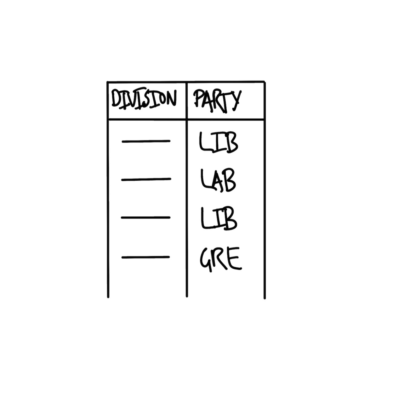 이제 데이터를 시뮬레이션해 보겠습니다. ’선거구(Division)’와 ’정당(Party)’이라는 두 개의 열로 구성된 데이터셋을 만듭니다. ’Division’은 1부터 151까지 숫자로 채우고, ’Party’에는 주요 정당 이름을 무작위로 할당하겠습니다.