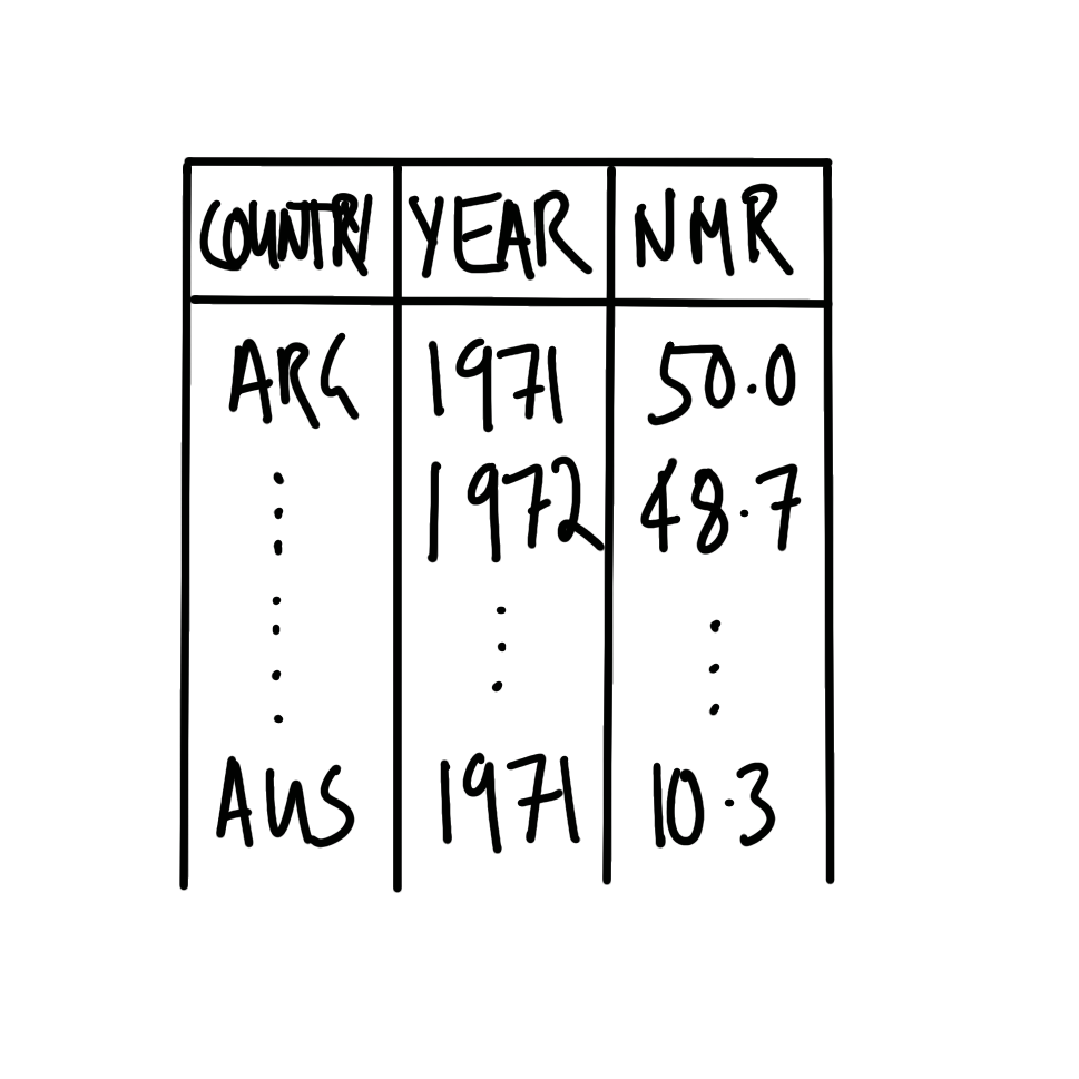 국가명, 연도, NMR 추정치를 포함하는 데이터셋과 이를 시각화한 선 그래프를 기획합니다(Figure 2.6).
