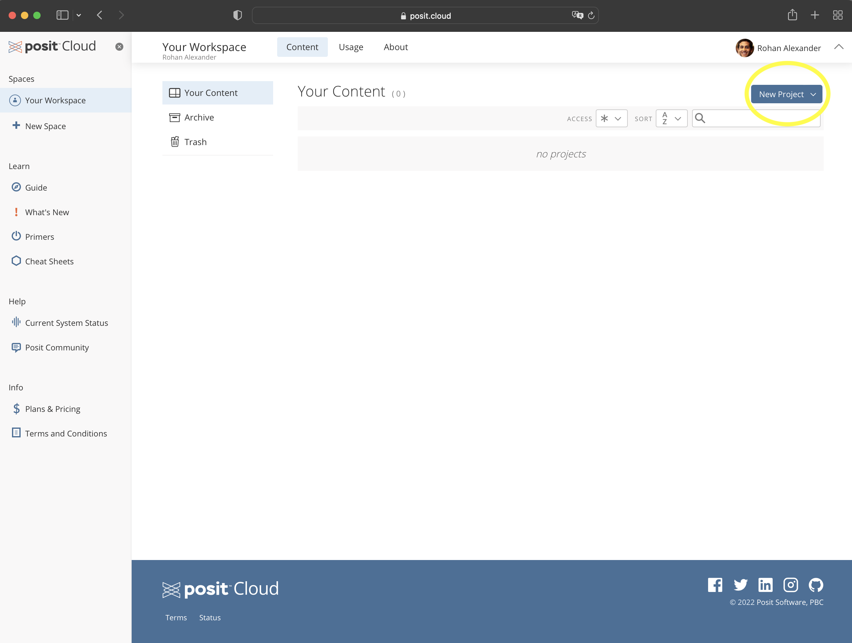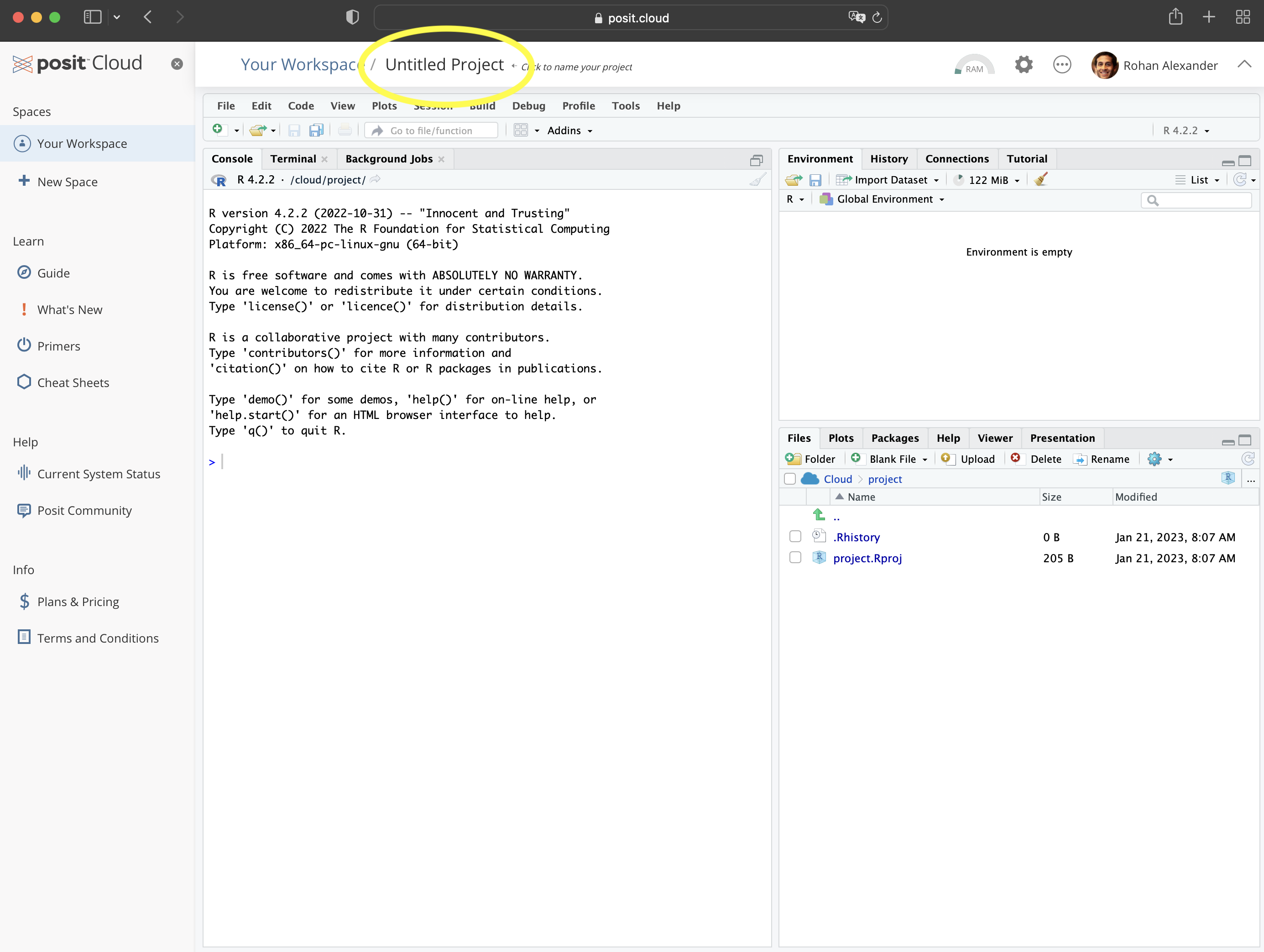 Posit Cloud에 로그인한 후 “Your workspace”에서 “New Project” \(\rightarrow\) “New RStudio Project”를 클릭해 새 프로젝트를 시작하세요(Figure 2.1 (b)). 상단의 “Untitled Project”를 눌러 프로젝트 이름을 자유롭게 정할 수 있습니다.