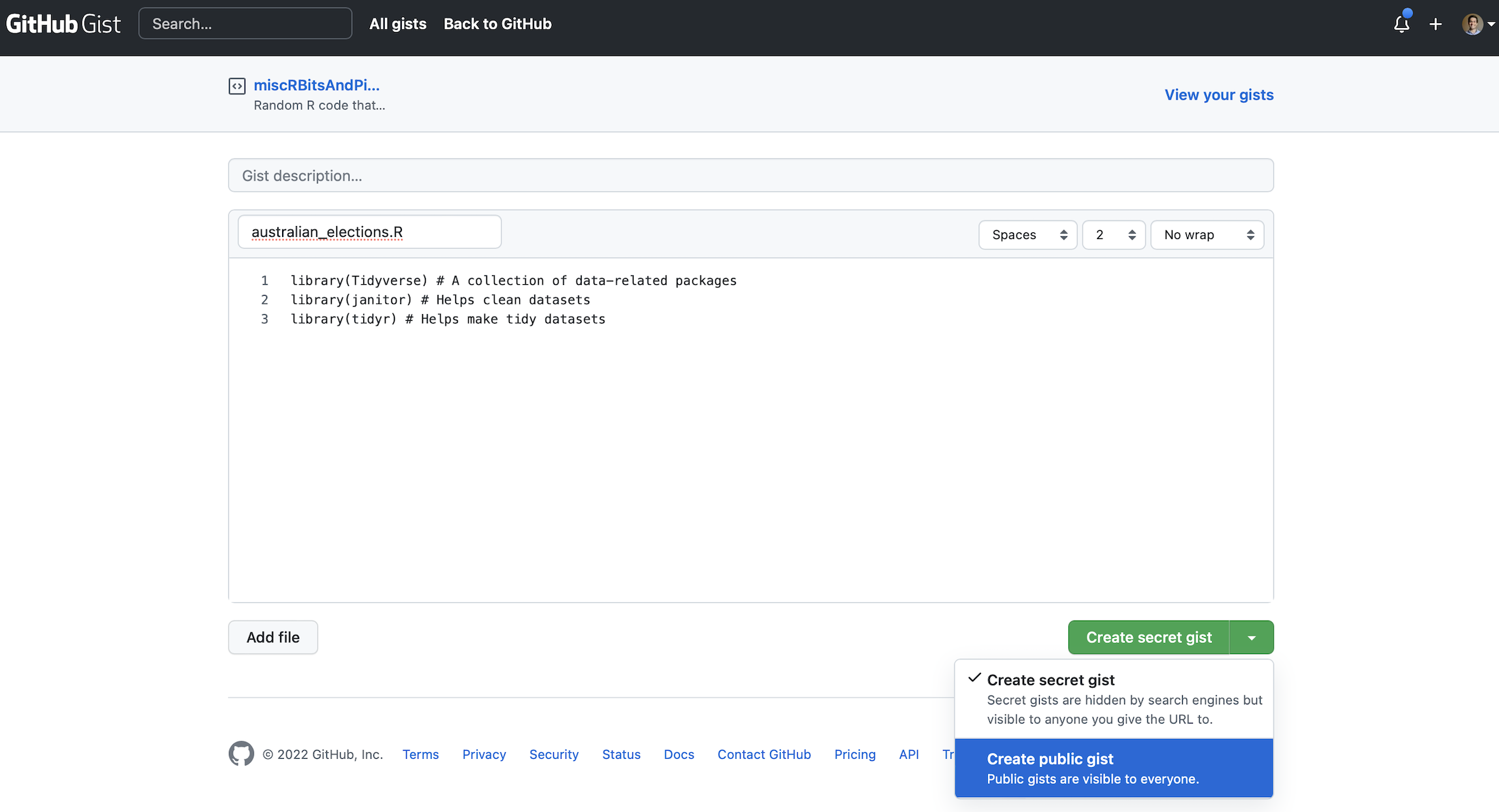 Create public gist를 클릭해 생성된 주소를 질문과 함께 공유하세요. 어떤 결과를 기대했는지, 현재 상황은 어떤지 상세히 설명한다면 훨씬 정확한 도움을 받을 수 있습니다.