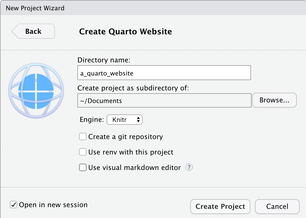 먼저 RStudio에서 새 프로젝트를 생성하십시오 (“File” \(\rightarrow\) “New Project…” \(\rightarrow\) “New Directory” \(\rightarrow\) “Quarto Website”). 프로젝트 이름을 지정하고 “Open in new session”과 “Create Project”를 차례로 선택하십시오 (Figure 4.1 (a)).