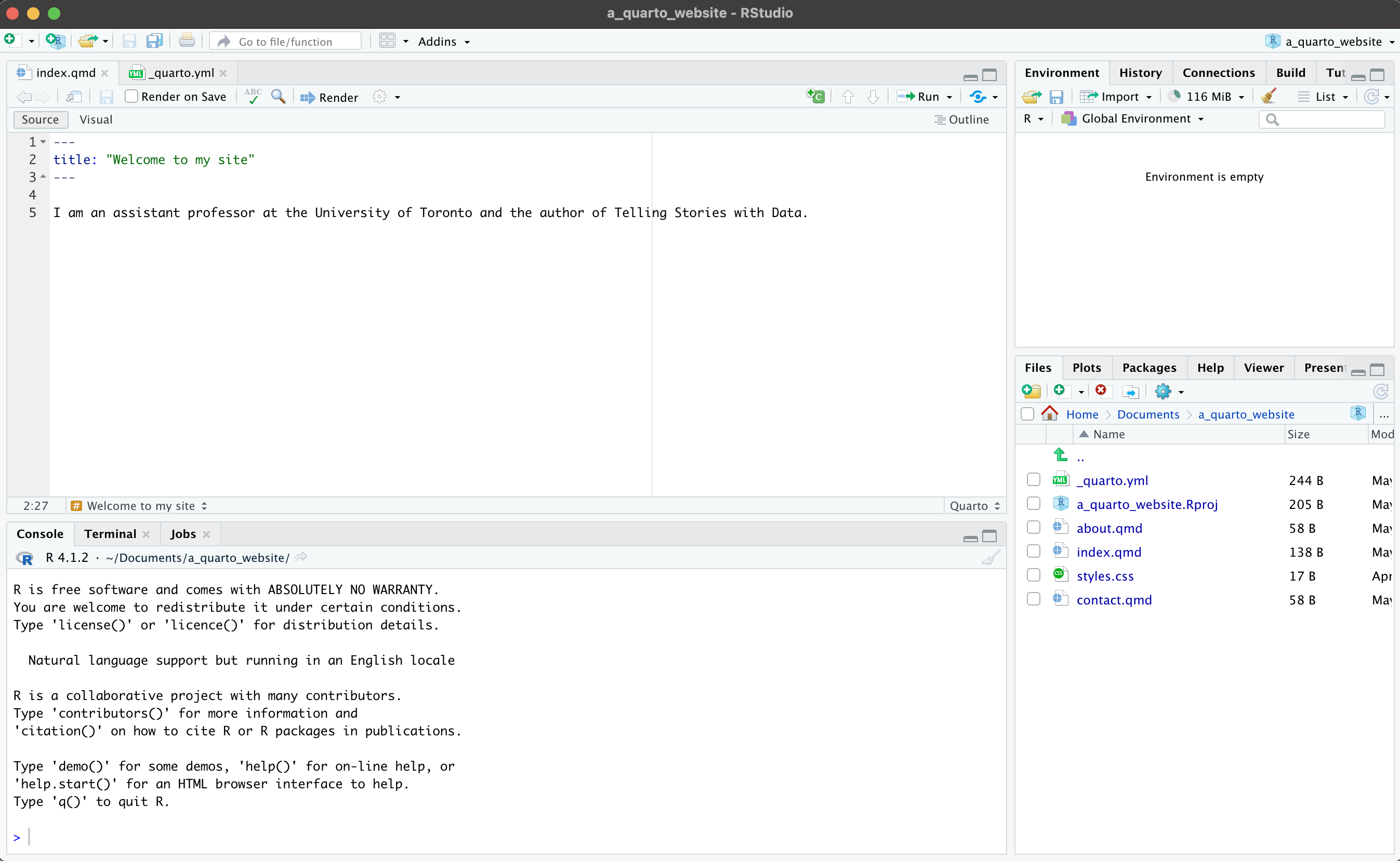 웹사이트는 자신의 작업 포트폴리오를 대외적으로 알릴 수 있는 훌륭한 소통 창구입니다. Quarto의 내장 웹사이트 기능을 사용하면, RStudio와 GitHub 설정이 완료된 상태에서 약 5분 만에 자신의 사이트를 온라인에 공개할 수 있습니다.