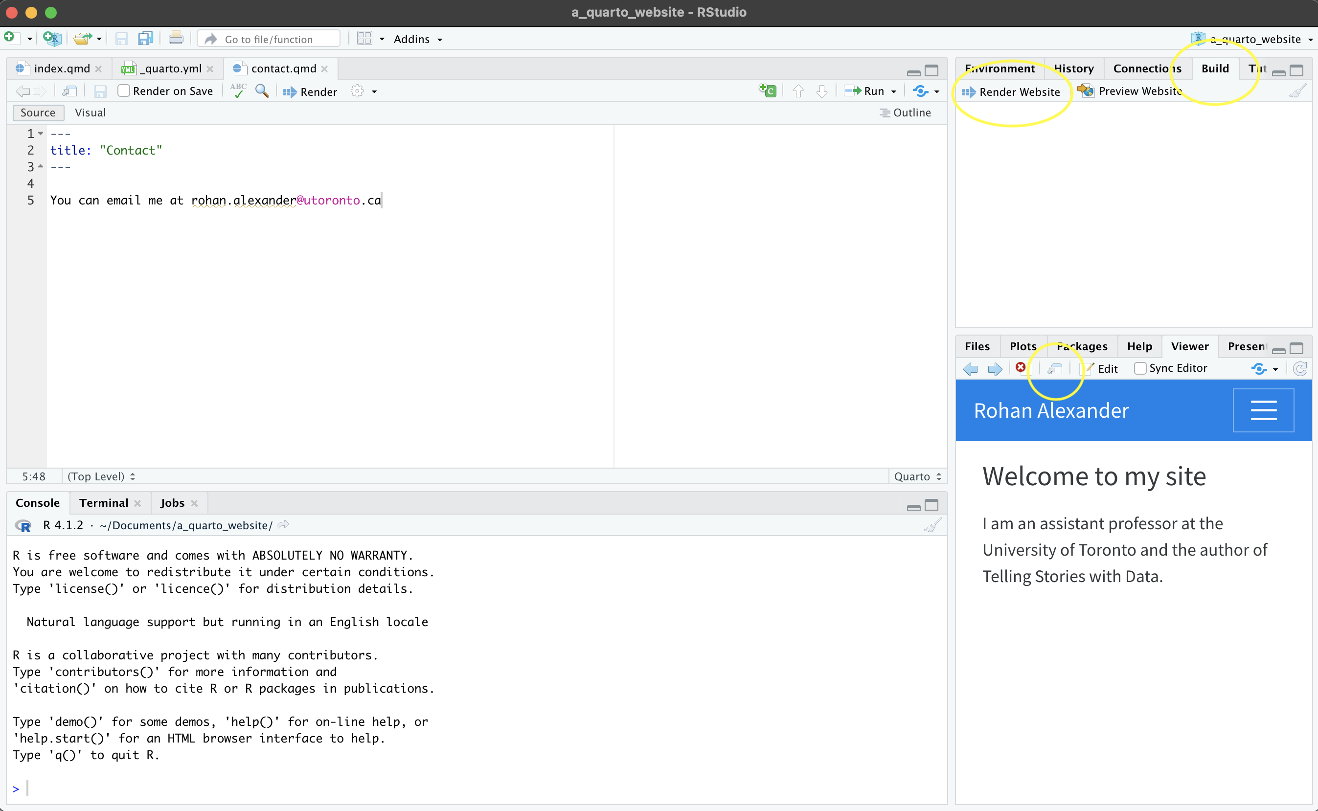 상단 메뉴의 “Build” \(\rightarrow\) “Render Website”를 클릭하면 기본 웹사이트가 생성됩니다 (Figure 4.1 (b)). 결과물은 기본적으로 RStudio의 “Viewer” 창에 나타나지만, 웹 브라우저에서 따로 확인할 수도 있습니다. 이제 “index.qmd” 파일의 제목을 바꾸고 자신의 소개 내용을 채워 넣어 사이트를 개인화해 보십시오 (Figure 4.1 (c)).