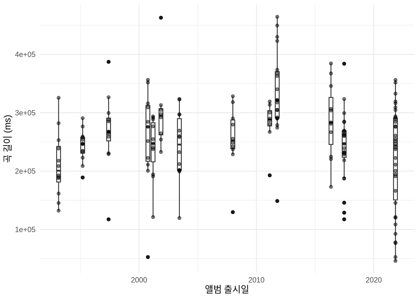 saveRDS(radiohead, "radiohead.rds")radiohead <- readRDS("radiohead.rds")수집된 데이터에는 노래마다 다양한 변수가 담겨 있습니다. 예를 들어 라디오헤드 노래들이 시간이 흐를수록 점점 길어지는 추세인지 궁금할 수 있죠 (Figure 7.4). Chapter 5 에서 배운 시각화 원칙을 살려 앨범별 분포를 보여주는 박스 플롯과 개별 곡을 나타내는 지터 플롯을 함께 그려보겠습니다.