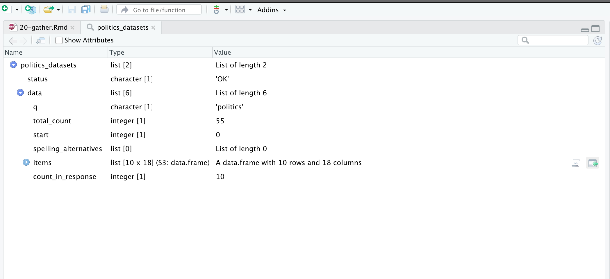 fromJSON("https://demo.dataverse.org/api/search?q=politics")복잡한 JSON 데이터는 RStudio의 View() 함수로 계층 구조를 펼쳐가며 살펴보는 게 좋습니다. 요소 위에 마우스를 올리고 나타나는 녹색 화살표를 누르면, 해당 위치까지 도달하는 R 코드를 자동으로 생성해 주어 아주 편리합니다 (Figure 7.2).