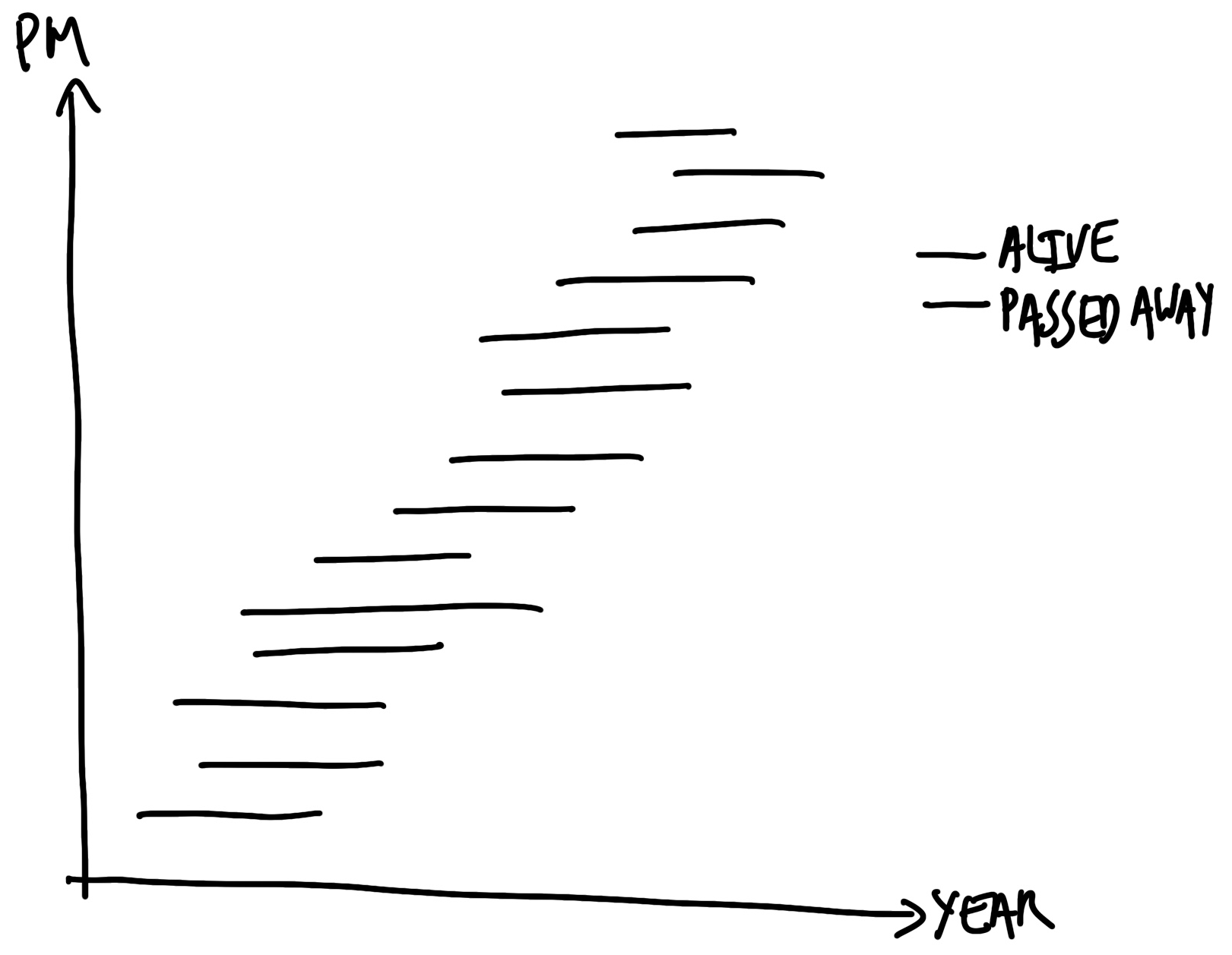 # 정제 과정은 본문 코드 참고이제 총리들의 생애 주기를 그래프로 그려봅시다 (?fig-pmslives). 생존 중인 총리는 색상을 다르게 해 현재 시점까지 선을 이었습니다.